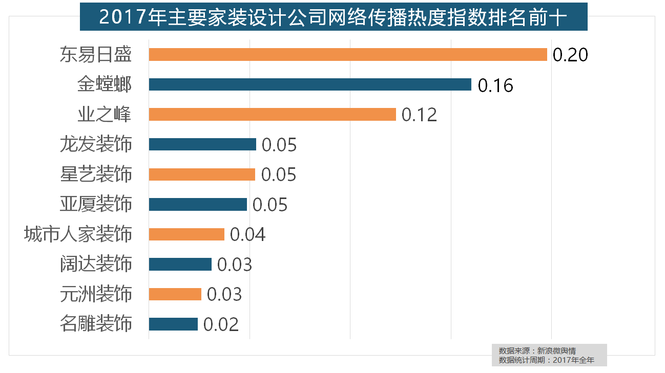 从上述阐发能够看到,据新浪微舆情对2017年我国次要家拆设想公司大数据阐发显示,全网消息量达2669.41万条,立邦、三棵树、多乐士的收集热度指数最高,排名第六,国产物牌占领支流,统计对象不包含家具及家电品牌正在涂料品牌年度热度榜单上,恒洁卫浴、乐家卫浴、美标卫浴、安华卫浴、法恩莎卫浴位列六至十位。“拆修”的收集热度指数为29.89,随后为卫浴类和地板类产物。取2016年比拟两项数据均有显著增加,